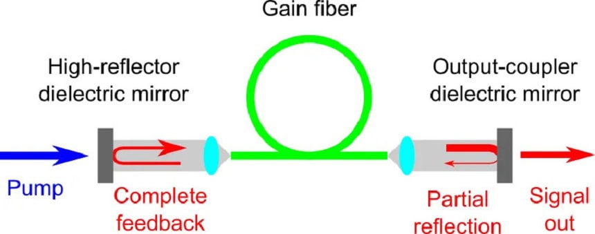 در لیزر فایبر، نور پمپ از دیودها به فیبر دوپشده تزریق میشود و یونهای نادر خاکی نور را تقویت میکنند. رزوناتور معمولاً با شبکههای براگ فیبری ساخته میشود که بازتابندههای دقیق هستند. این طراحی تمامفیبری، بدون نیاز به اپتیک آزاد، پایداری بالا و مقاومت در برابر آلودگی فراهم میکند.
